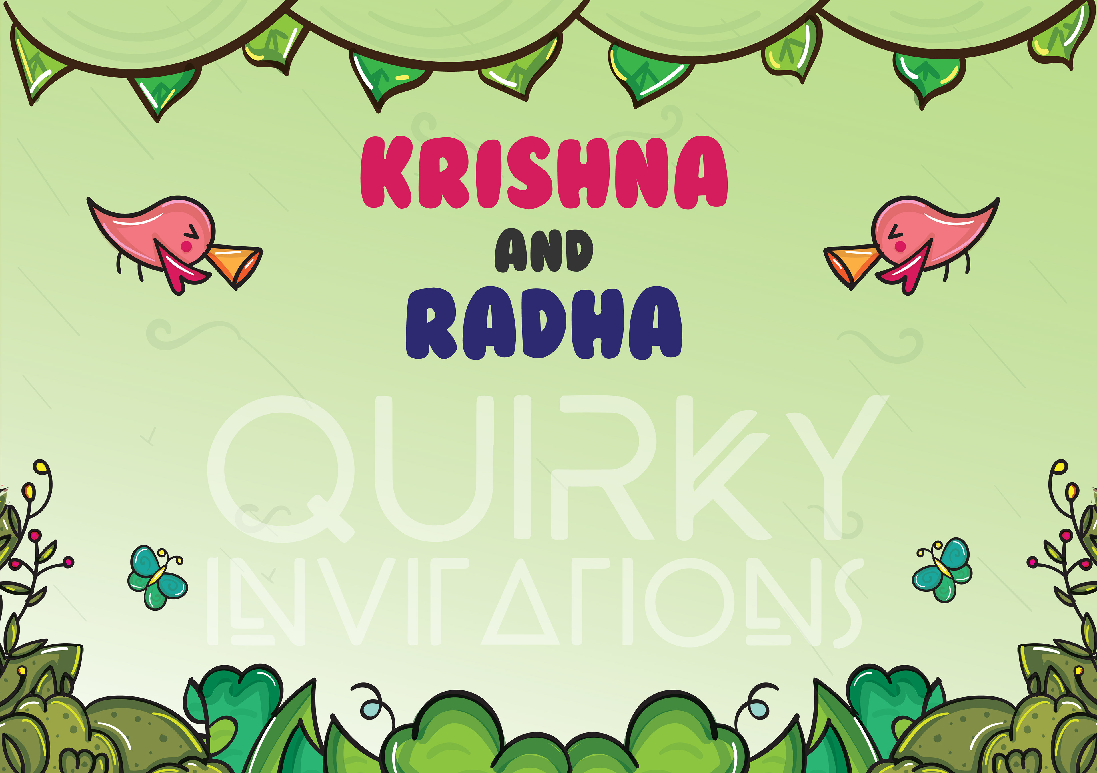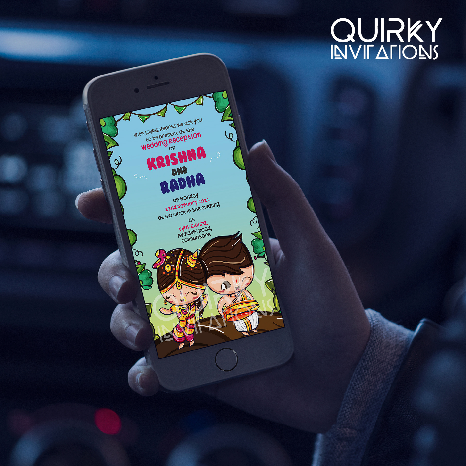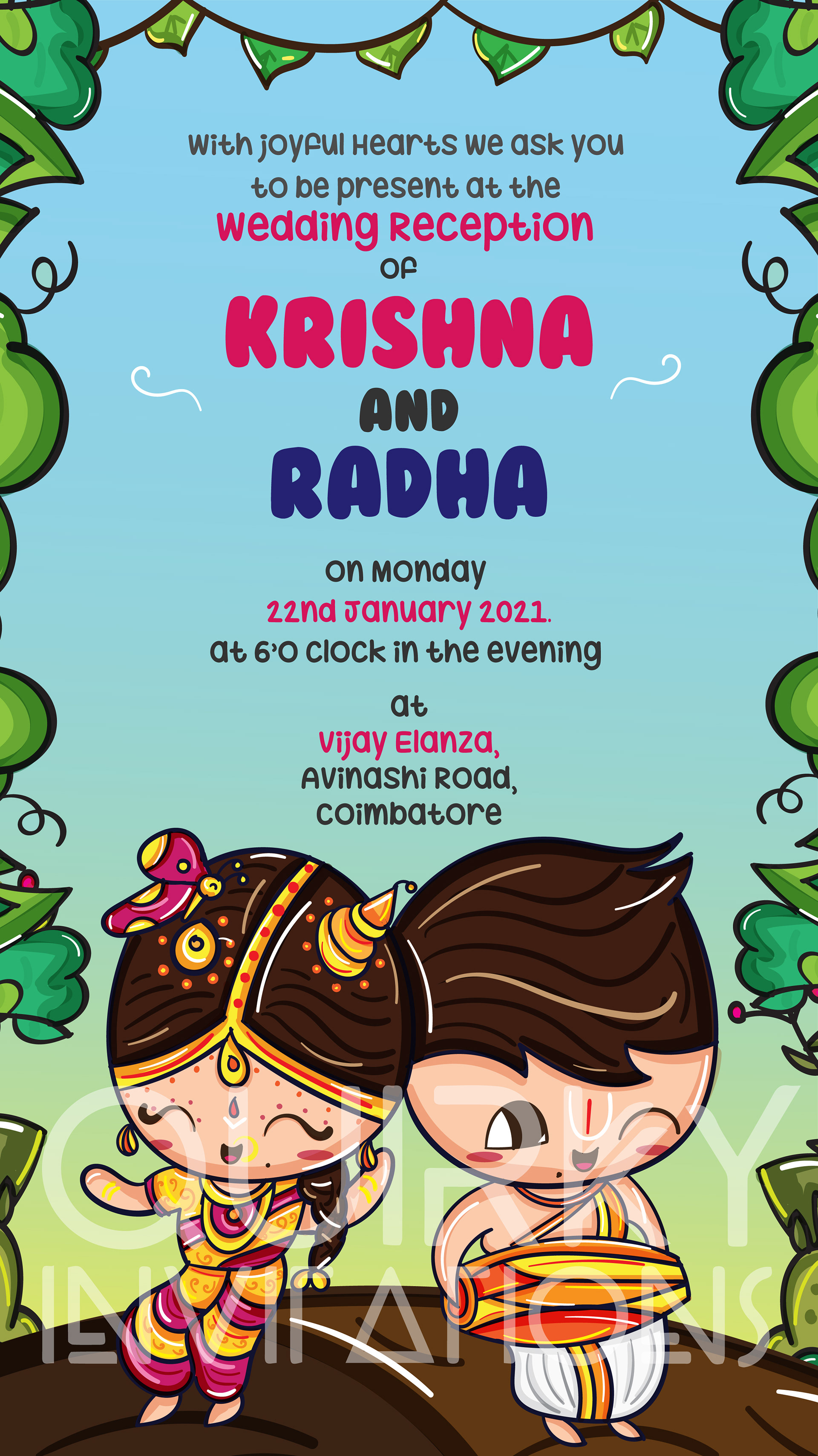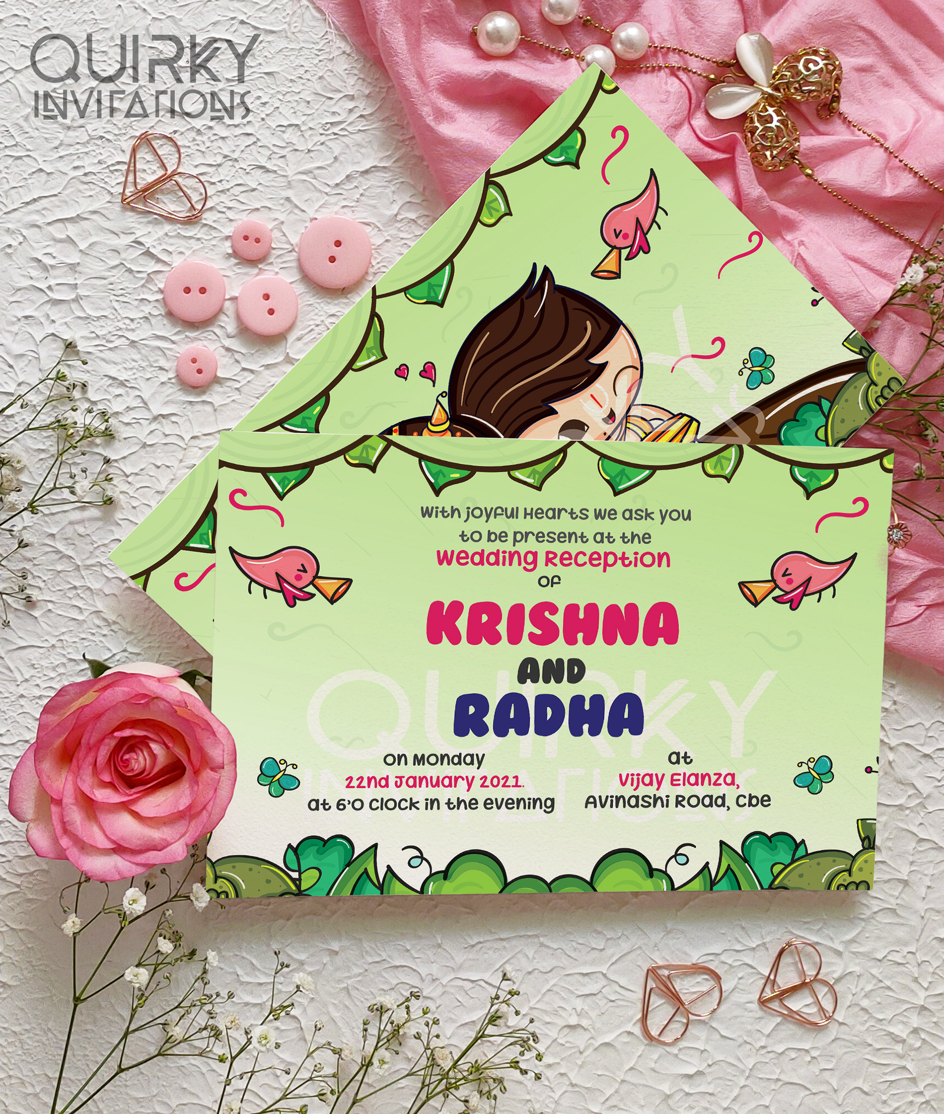 This cute and creative Iyengar wedding card features the bride & groom in their traditional attire. While the groom plays Melam in his Panchagajam, the bride sways in her madisar saree & Aandal kondai. Isn't the rabbit cute when playing the flute!