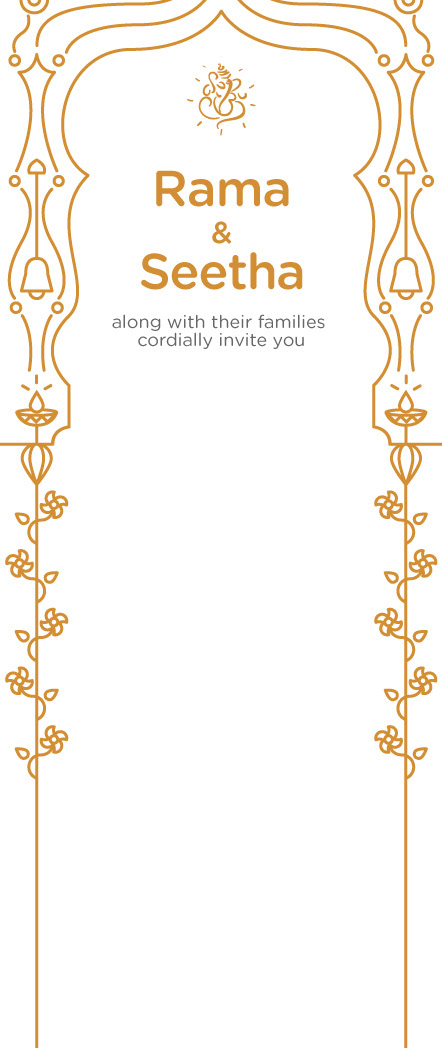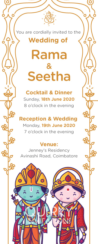 This simple yet elegant invite portrays a cute couple dressed in traditional Ram Seetha wedding attire. As you stand with your soulmate gleaming with joy, inside the mandap as your dear ones cheer your sacred union, it is a memory that’s etched forever.
