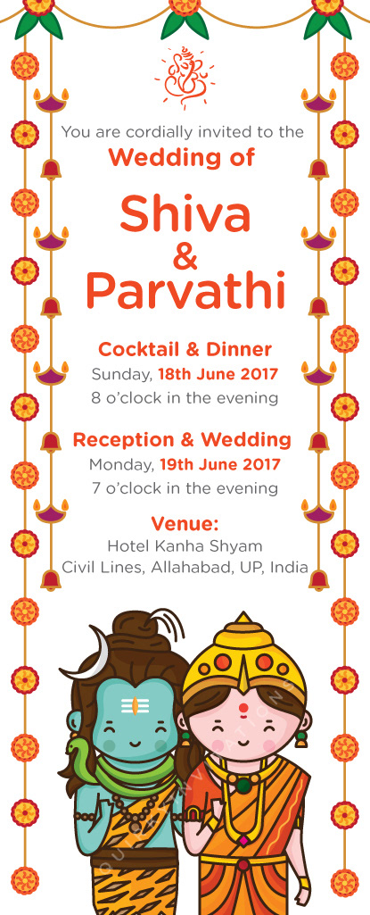 This simple yet elegant invite portrays a cute couple dressed in traditional Shiva Parvathi wedding attire. As you stand with your soulmate gleaming with joy, inside the mandap as your dear ones cheer your sacred union, it is a memory that’s etched forever.
